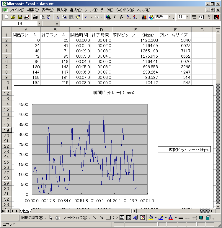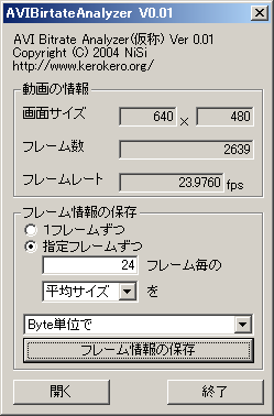 | AVIファイルから動画のフレーム毎のデータサイズを取得するためのツールです。 対応OSはWindows95/2000以降なら動くと思います。 【ダウンロード】(AVIBA001.lzh/75KB) 実行すると、こんな画面になります。 ![]() これで出力したタブ区切りテキストを、エクセルで開いて、ビットレート配分を見たりして、 圧縮の設定の参考にデモして下さい。 エクセルでグラフにした例: ![]() |