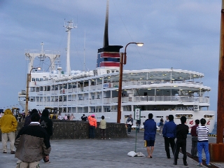 | まだまだ、揺れています。 今は、朝の2時です。 つか、2時間しかねてねー お手洗いに行って再度寝る で、今度は4時に起きる。 隣のはっくるべりーも、もぞもぞ起きだす。 5時になって船内放送 「本船はまもなく三宅島錆ヶ浜港に到着します。 港の、ガスレベルは3。 下船の際には、ガスマスク着用が義務づけられています。」 ・・・Σ(゚Д゚;) ガスマスク持ってないよママンorz 案内所の人に聞いてみる。 「ガスマスク無いと下船できないんですか?」 「乗船の際に買わないといけません。 あと、着用の判断は我々ではなく行政ですので知りません。 」 うーむ。どうしよう・・・ 船が港に近づくと、 硫黄のにおいがしてくる。 ・・・やばいかも・・・ と思いつつ、何も付けずに下船。 普通に下船できました。 ってか、ガスマスク付けてない人たくさんいるし。 むしろ、桟橋の人も着用率は50%ぐらい。
